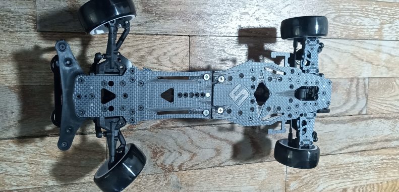 Modification on my D5S SPORT EDITION to get a millimetric configurable wheel base from 250mm to 262mm and fit “any” 1:10 body shell. I also took the optional top motor mount. The back motor mount is a bit too on the rear – i.e. you can’t have a z4 coupe body shell. Once you are